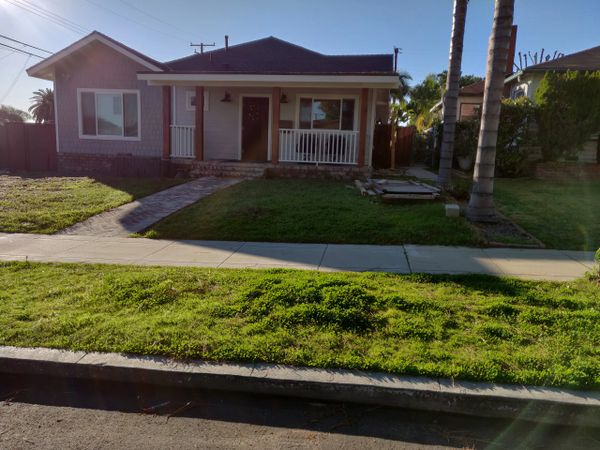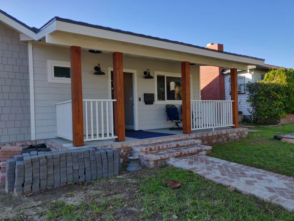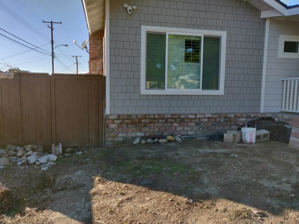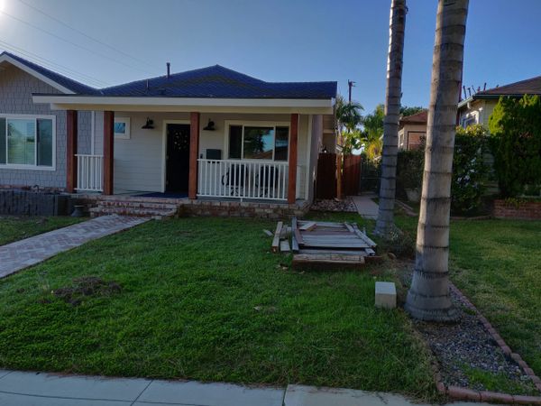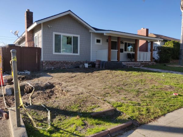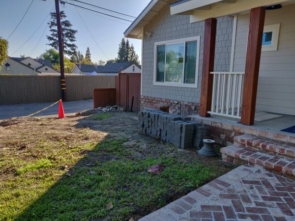 Complete redesign of front yard - dry riverbed, drought tolerant plants, new sod, silver ground cover, path to backyard, trees and lighting.