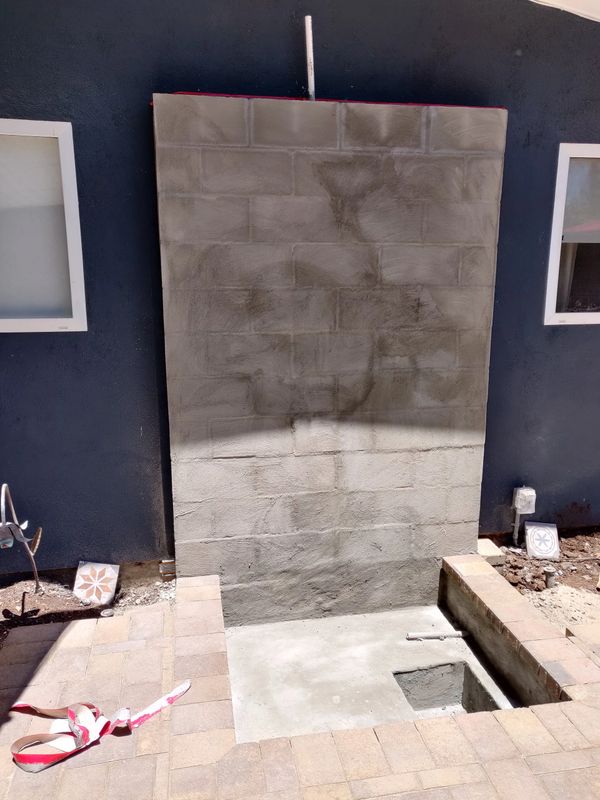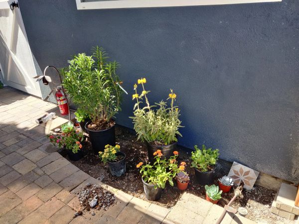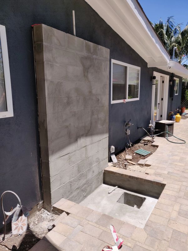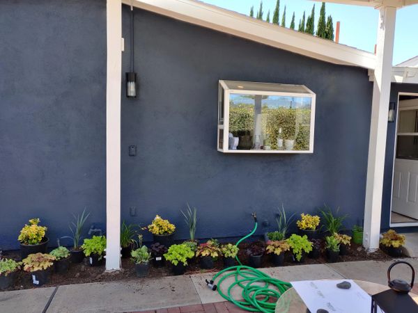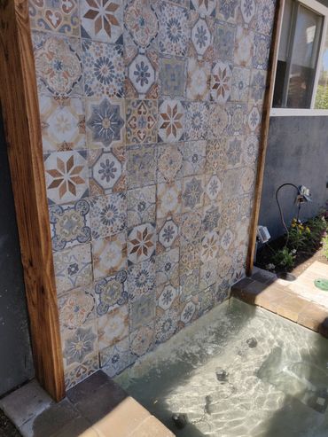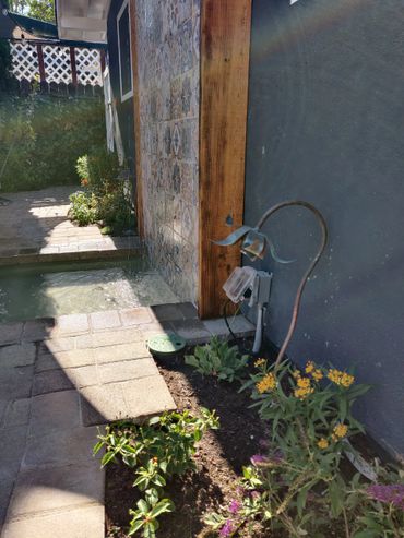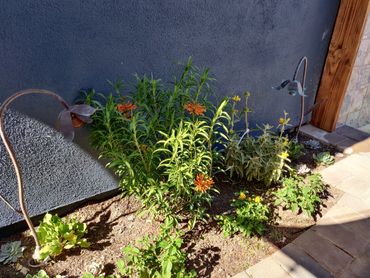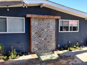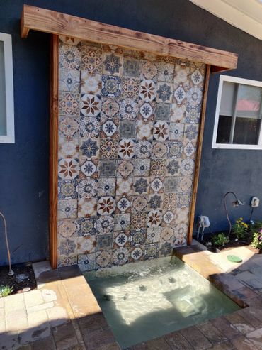 We created a custom tiled water falling feature with a fun "doggie splash pool" for our client's 4 legged friends to cool off and play. All the yard's plantings were refreshed with colorful plants.